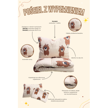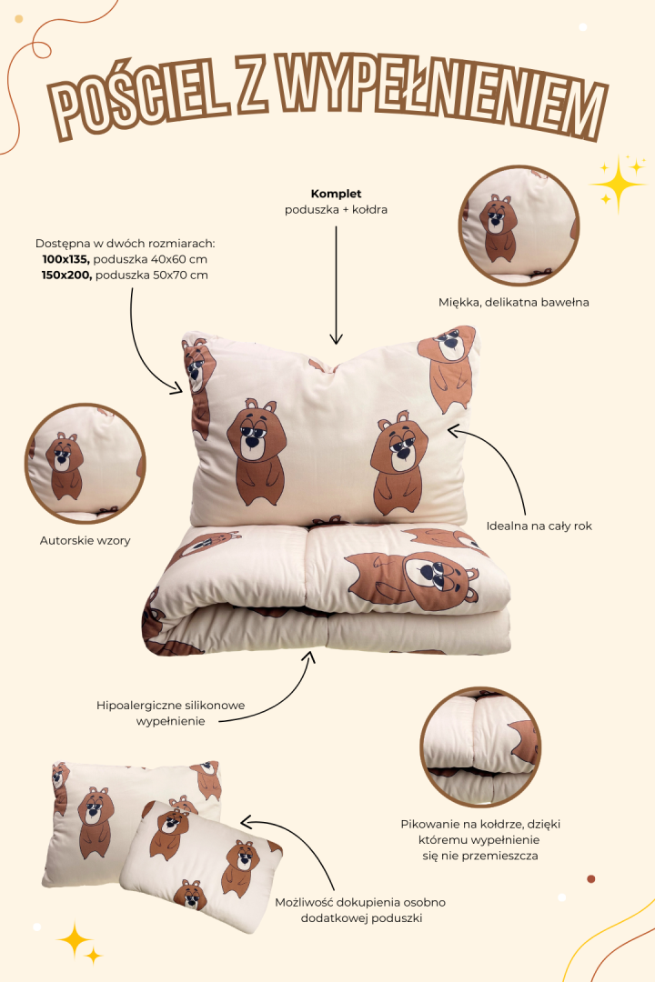 Super soft and light set of filled bedding – perfect start to sleep and dream long whole night. Set includes 2 pieces: soft pillow and even softer duvet. Made of organic cotton with antiallergic silicone filling which is perfect for delicate skin.