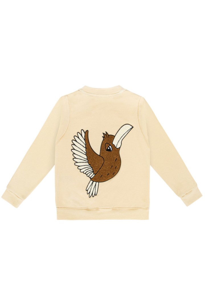 Bomber jacket with chenille embroidery on the back and decorative leather on the shoulder is a perfect choice for upcoming season.