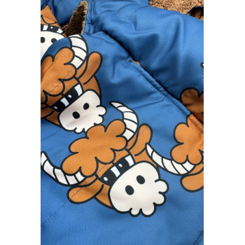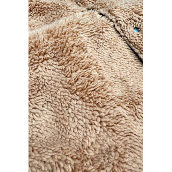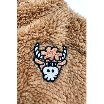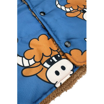 Fastened with snap buttons (on both sides) with beautiful print on one side and nice and cozy sheep boa and embroidery on the other side.