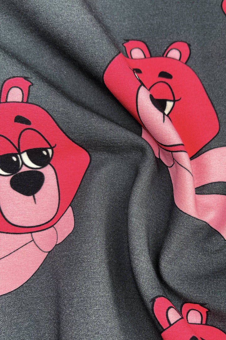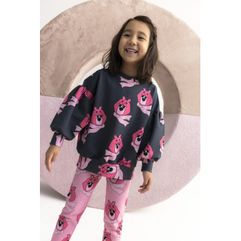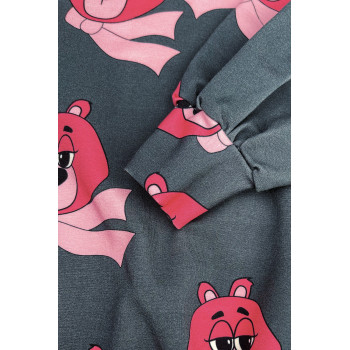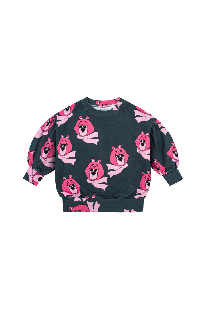 Loose sweatshirt with pleated, puffy sleeves. This all-over-printed piece can make two adorable outfits – one can be with bottom covered with the same print, this creates a totally unique look. Another one can match the sweatshirt with plain bottom – such an outfit would even distinguish the sweatshirt more.