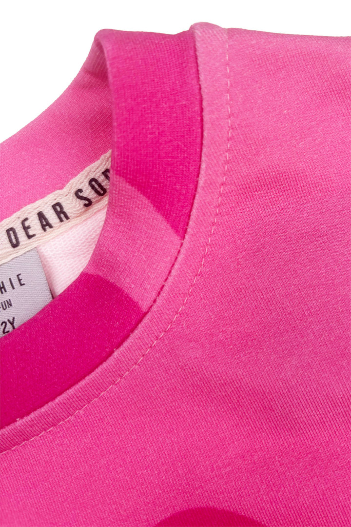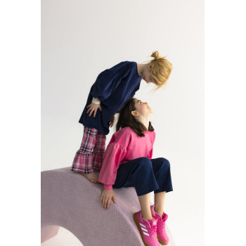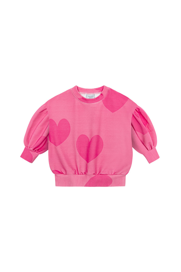 Loose sweatshirt with pleated, puffy sleeves. This all-over-printed piece can make two adorable outfits – one can be with bottom covered with the same print, this creates a totally unique look. Another one can match the sweatshirt with plain bottom – such an outfit would even distinguish the sweatshirt more.