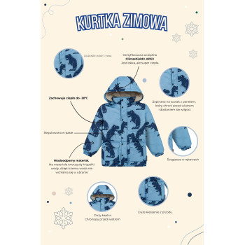Long winter jacket perfect for those really cold days. It’s water repellent, has a big detachable hoodie and inner drawstring so it fits perfectly. We also haven't forgotten about pockets for our Little Explorers for their little-big treasures, hanger and zipper with security under neck, to make sure putting it on is a pure pleasure.