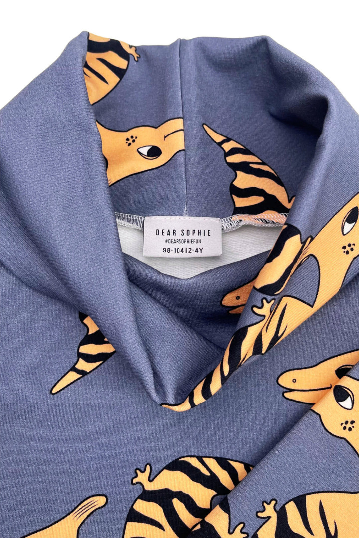 Doskonały dla wszystkich Maluchów nielubiących szalików. Nasza bluza z kominem jest idealna na chłodniejsze dni - miękka, wygodna i w całości pokryta naszymi i Waszymi ulubionymi ilustracjami DEAR SOPHIE. To jedna z najchętniej wybieranych opcji na sezon jesienno-zimowy. Wykonana z miękkiej, wysokiej jakości bawełny organicznej, wykończona czarną metką DEAR SOPHIE na plecach. Stworzysz z nią prosty, ale bardzo funkcjonalny zestaw – połącz ją ze spodniami lub jeśli wolisz nieco ciekawsze looki – wybierz bluzę w większym rozmiarze i połącz ją z legginsami.