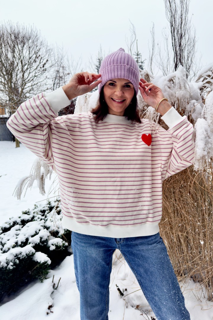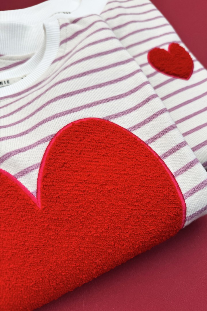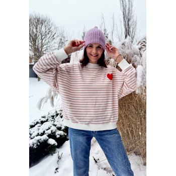 Jeśli szukasz bluzy, która jest jednocześnie wygodna i wygląda świetnie bez żadnego kombinowania — to jest ten typ. Paski robią stylizację od razu, a małe haftowane serce na piersi dodaje jej uroku i subtelnego „czegoś”. To detal, który zauważysz Ty i który zauważą inni — bez efektu przesady.