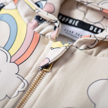 Ta bluza to nasz hit! Duży kaptur chroni przed wiatrem i chłodem - również tych, którzy nie lubią nosić czapek. Bezniklowy zamek z zabezpieczeniem pod szyjką umożliwia szybkie i łatwe ubieranie maluszka. Bluza posiada ozdobną skórkę na ramieniu i bawełnianą tasiemkę z logo DEAR SOPHIE na karku.