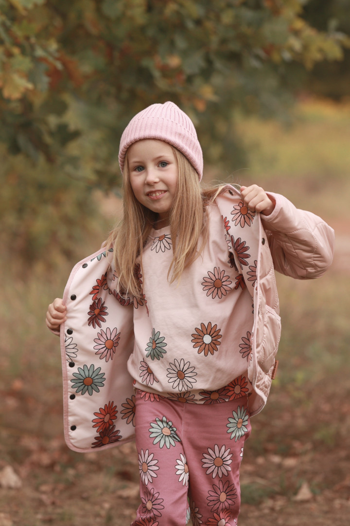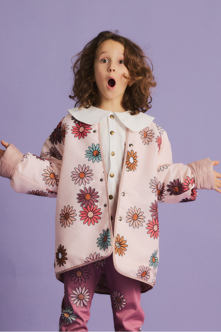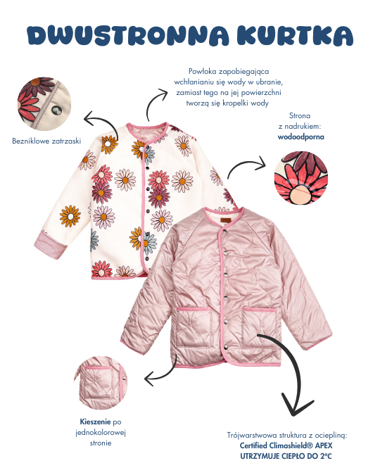 Pokochaliśmy ją od pierwszego wejrzenia i wiemy, że będzie to także Wasz ulubieniec. Przepiękna dwustronna kurtka z kwiatowym nadrukiem po jednej stronie i gładkim pikowanym materiałem po drugiej. Dzięki temu, że jest dwustronna możesz łączyć z nią stworzyć wiele stylizacji. Duże kieszenie po gładkiej stronie pomieszczą wszystkie skarby (i rękawiczki też).