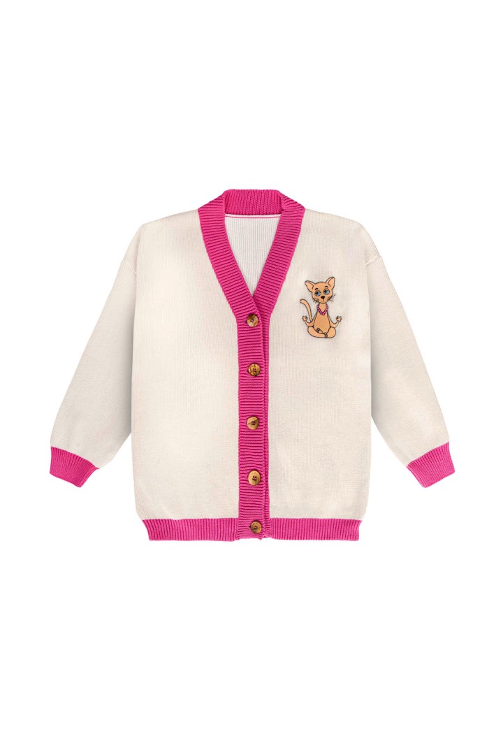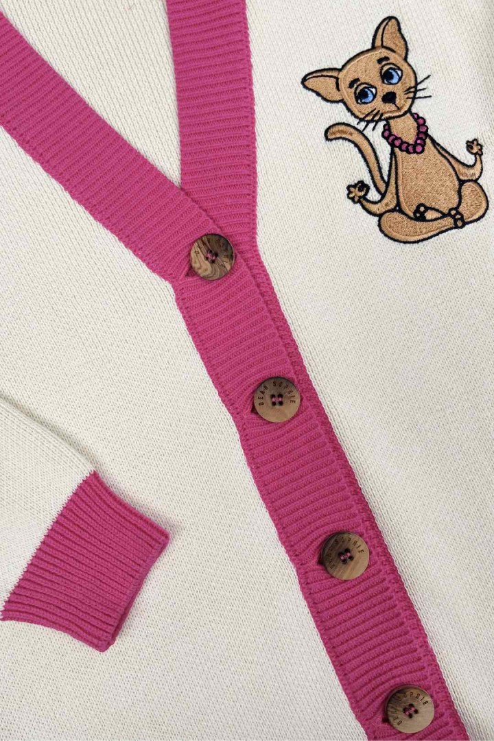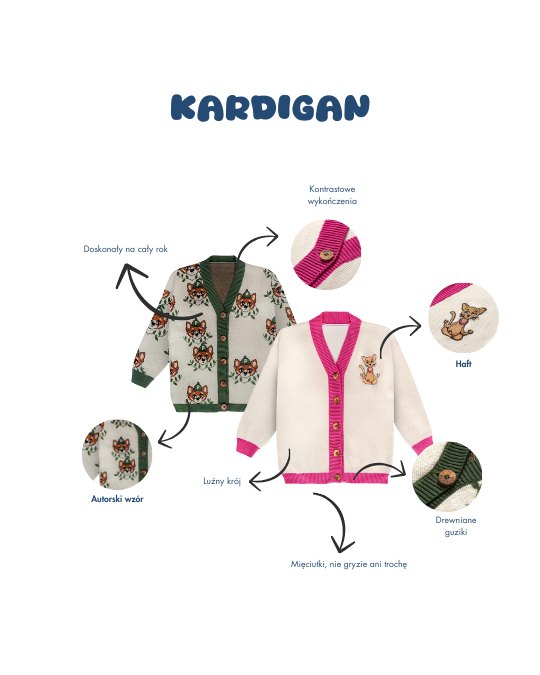 Takiego ubranka nie znajdziecie nigdzie indziej. Przepiękny rozpinany kardigan, z wyhaftowanym wzorem na przodzie. Mięciutki, nie gryzie ani trochę (gwarantujemy!), zapinany na drewniane guziki z logo DEAR SOPHIE. Sprawdzi się przez cały rok – może służyć zamiast kurtki, jako okrycie wierzchnie oraz zamiast bluzy.