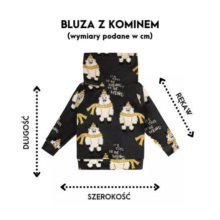 Doskonały dla wszystkich Maluchów nielubiących szalików. Nasza bluza z kominem jest idealna na chłodniejsze dni - miękka, wygodna i w całości pokryta naszymi i Waszymi ulubionymi ilustracjami DEAR SOPHIE. To jedna z najchętniej wybieranych opcji na sezon jesienno-zimowy. Wykonana z miękkiej, wysokiej jakości bawełny organicznej, wykończona czarną metką DEAR SOPHIE na plecach. Stworzysz z nią prosty, ale bardzo funkcjonalny zestaw – połącz ją ze spodniami lub jeśli wolisz nieco ciekawsze looki – wybierz bluzę w większym rozmiarze i połącz ją z legginsami.